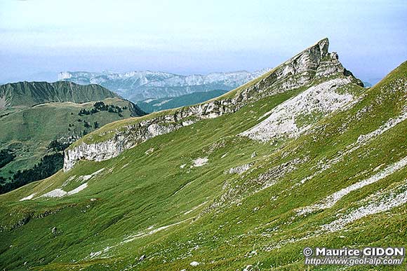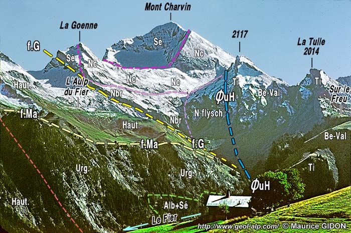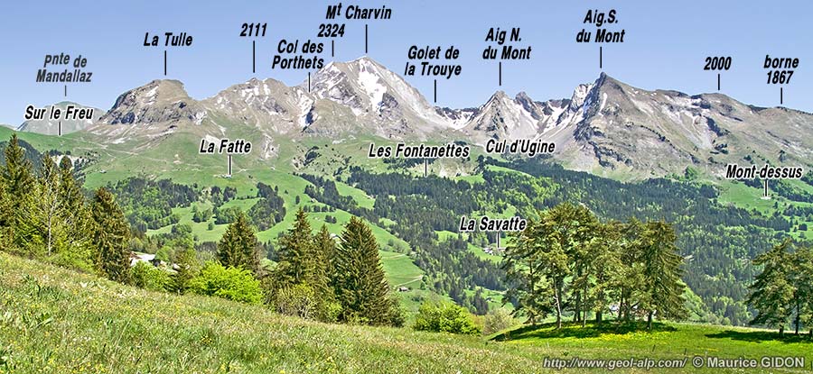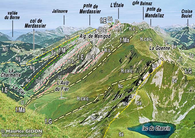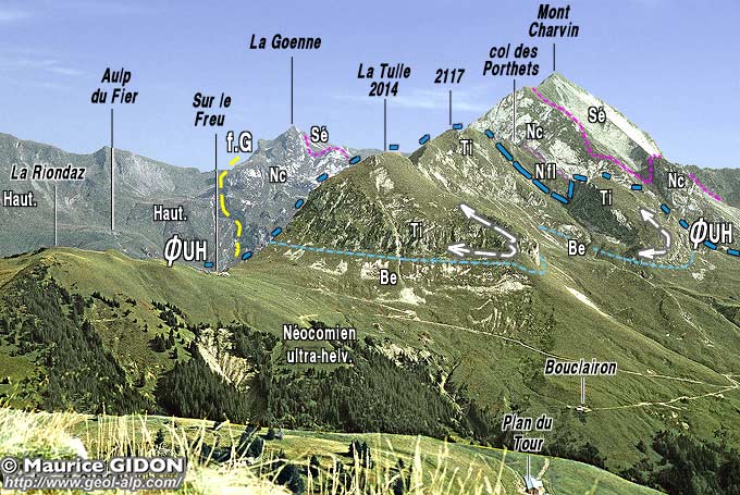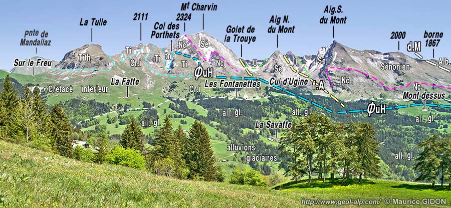 ![]() Le versant occidental de la crête du Charvin, vu du collet de La Botte, au pied sud-ouest de la montagne de Sulens. ØuH = chevauchement des écailles ultrahelvétiques ; f.A = faille des Aiguilles du Mont ; d.M = décrochement de Marlens (voir la page "Charvin SE") . |