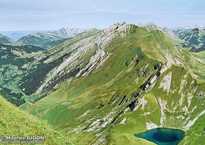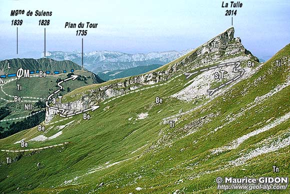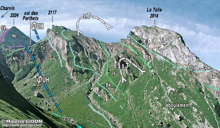 L'arête de la Tulle est essentiellement sculptée, dès le col des Porthets, dans les unités ultrahelvétiques* du flanc oriental du synclinal de Serraval ; mais la coupe, presque N-S, qu'elle en donne est globalement oblique aux couches jurassiques et crétacées de leur succession. En effet elles plongent dans leur ensemble vers le nord-ouest, comme leur surface de chevauchement, car toute la tranche charriée à été basculée, après le charriage, avec l'ensemble du flanc du synclinal de Serraval).