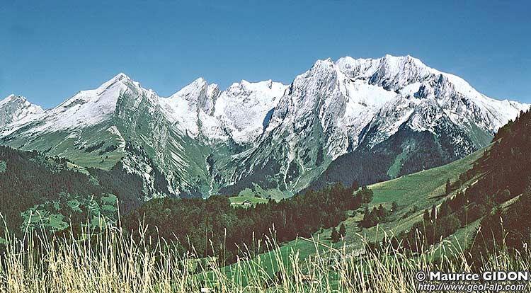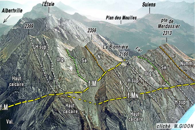 B/ Le versant opposé, oriental, de la montagne est constitué par un long et haut abrupt, régulier et dépourvu de discontinuités, qui tranche la succession des couches de la série sédimentaire, au dessus d'une ligne de replats d'alpages : celle-ci correspond à la combe monoclinale des Terres Noires et représente l'ultime prolongement septentrional du sillon subalpin. Le trait structural, peut-être le plus frappant, que révèle ce versant de la montagne est qu'elle est en fait hachée transversalement à sa crête par un système de multiples failles.