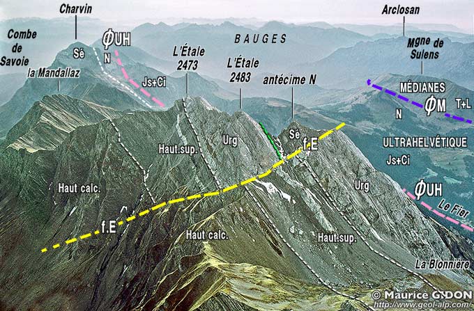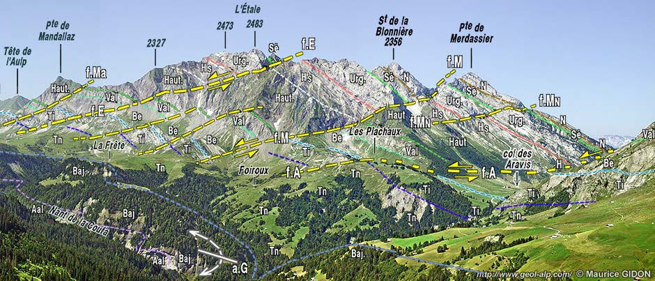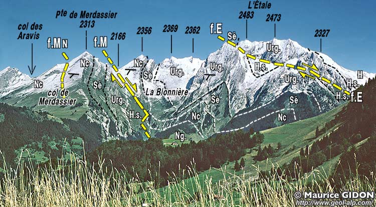 Ces failles du chaînon de L'Étale font en réalité partie d'une famille de cassures encore plus étendue, le faisceau des failles du Charvin, qui affecte tout le crêt du flanc est du synclinal de Serraval ; ses éléments semblent se rattacher en tant que satellites à une cassure principale qui est la faille de la Goenne (voir la page "Charvin"). On trouvera une analyse de ce dispositif tectonique à la page d'aperçu d'ensemble sur le chaînon méridional des Aravis. |