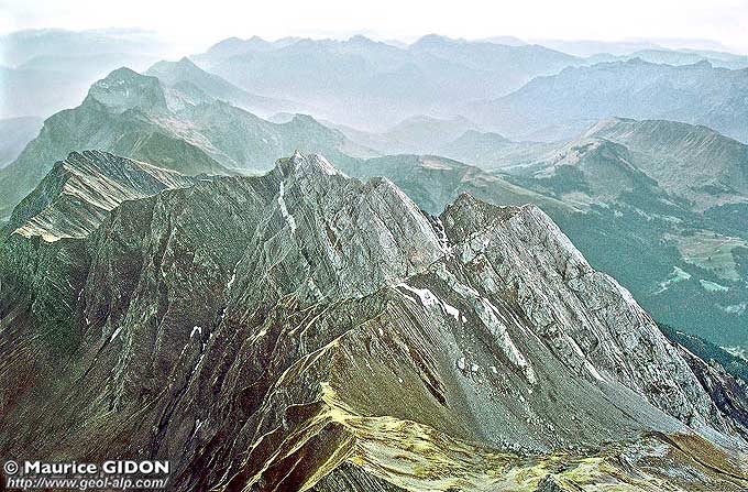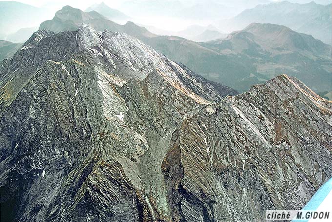 C/ L'observation (notamment aérienne) de l'arête sommitale permet en particulier de mieux voir comment elle est recoupée par les deux cassures majeures :