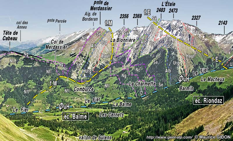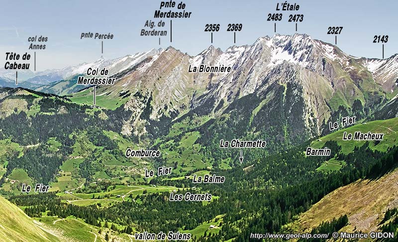 - 2 - La brèche 2166 qui sépare la Pointe de Merdassier du sommet 2356 de "la Blonnière" (sans nom sur les cartes) est causée par le passage de la faille de Merdassier : elle abaisse le Nummulitique du sommet 2356, en le décalant cartographiquement vers le sud-est, par rapport à celui de la Pointe de Merdassier (lui aussi formé par la barre des calcaires nummulitiques) et détermine, en versant ouest, le ravin principal de la Blonnière. Du fait qu'elle pend vers le sud, comme celle de l'Étale, son tracé traverse aussi la crête en dessinant un chevron* pointant vers le nord.