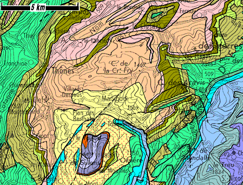 Les deux vallées du Fier et du Nom, qui convergent à Thônes, suivent respectivement les bordures occidentale et nord-occidentale de la grande zone à relief mou et boisé qui sépare les Bornes proprement dites du chaînon des Aravis. Cette zone correspond au contenu tertiaire (essentiellement molasses rouges et flysch à grès de Taveyannaz) de la cuvette structurale de Thônes. L'absence de niveaux repères et le couvert végétal y masque la présence de replis orientés NE-SW, tels le synclinal de Thônes , lesquels sont en outre ployés par un vaste synclinal de Serraval . Il s'agit donc d'un synclinorium*, mais l'axe de ce pli majeur n'est pas parallèle à celui des plis plus mineurs et traverse ces derniers en oblique (voir la carte structurale).