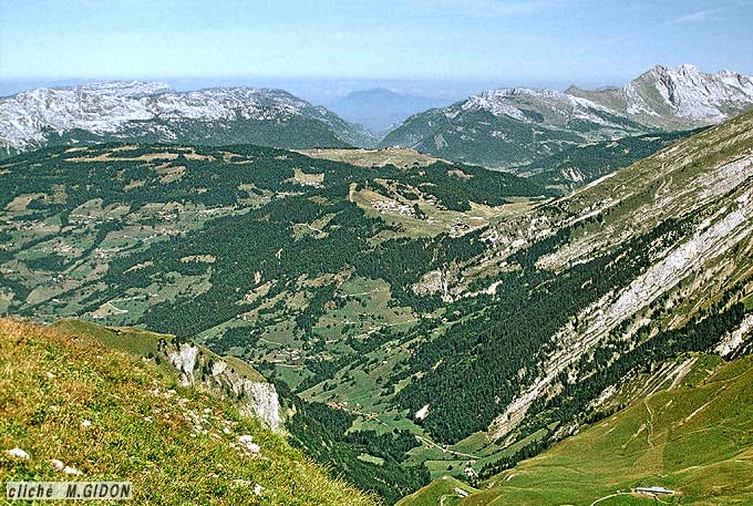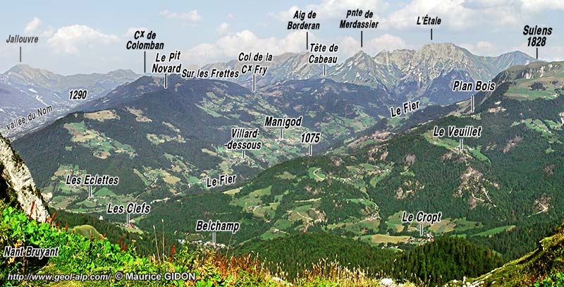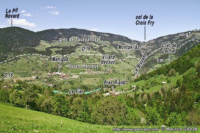 ![]() Le village de Manigod et le col de la Croix Fry, vus du sud depuis les pentes de Sulens. Globalement les bancs de grès de Taveyannaz s'enfoncent, en direction de l'observateur, sous le flysch marneux ultrahelvétique, qui occupe le cœur d'un synclinal très ouvert (celui de Serraval), à axe incliné ici de l'arrière vers l'avant. |