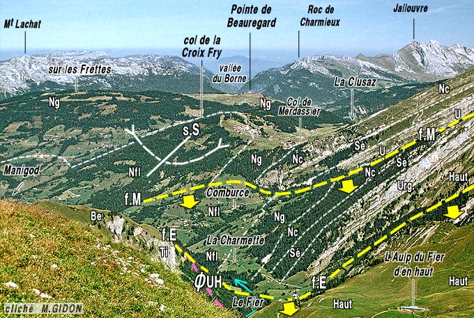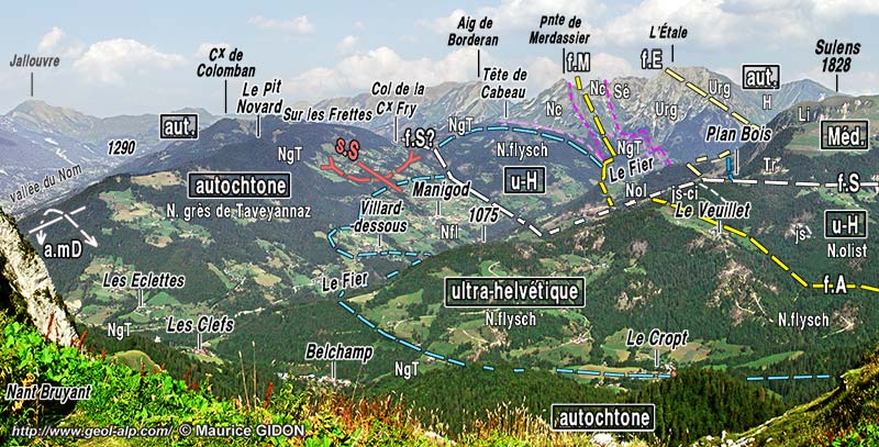 Mais ce versant de la vallée est en outre parcouru en oblique par les failles sub-méridiennes qui se rattachent au faisceau de l'Arcalod : bien que leurs tracés soient impossible à suivre avec exactitude au sein des flyschs nummulitiques, il apparaît assez évident qu'elles se raccordent ainsi avec les failles de Merdassier et de l'Étale.