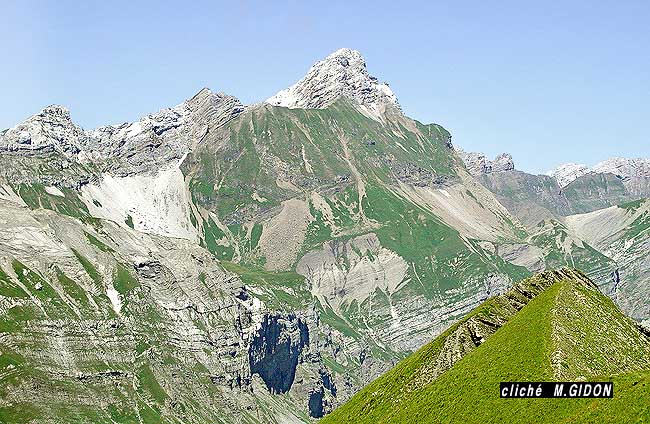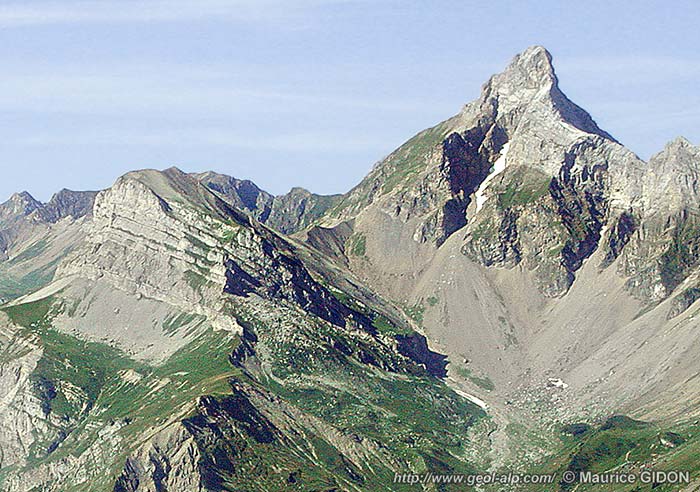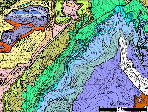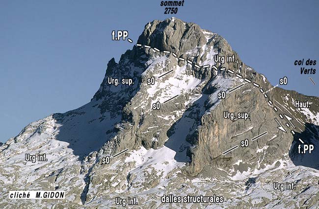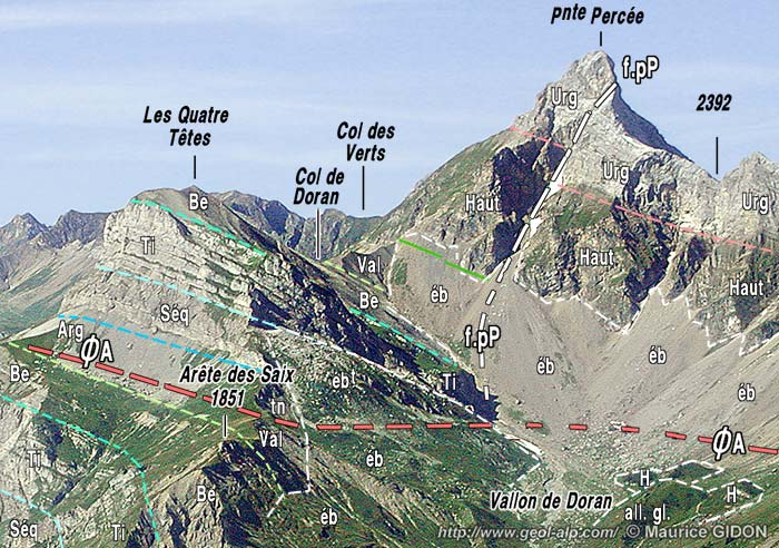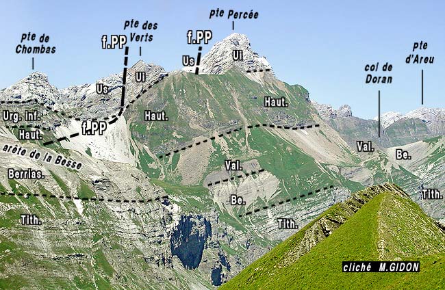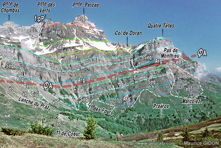 En fait il y a là un relais entre deux barres superposées, qui se terminent symétriquement en se faisant biseauter par la surface de chevauchement : vers le SW la barre inférieure s'effile sous la Tête du Gréppon, en rive droite du ravin du torrent des Fours, qui descend de la Pointe de Chombas (voir la page "Mont Fleuri"), tandis que la barre supérieure disparaît plus au nord en tête du vallon de Doran (image suivante).