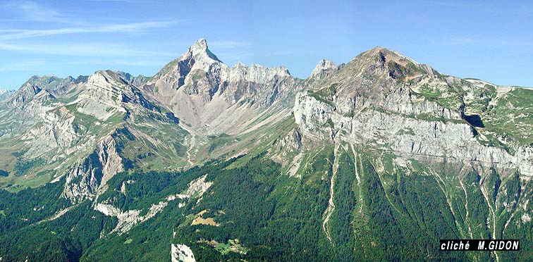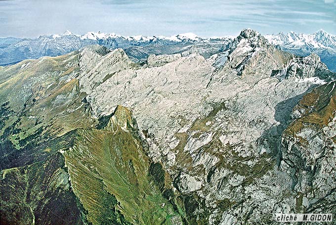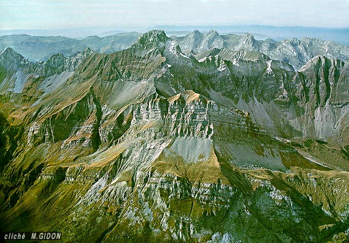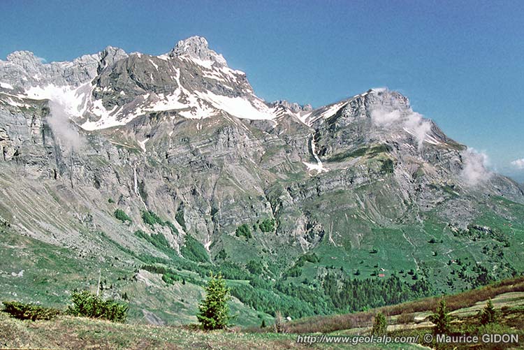 ![]() L'extrémité nord du chaînon de la Pointe Percée vue de l'est - nord-est, depuis la pointe de l'Arbaron (golf de Flaine). La perspective de ce cliché montre d'une façon particulièrement claire que le redoublement de la barre tithonique qui se produit sous le sommet des Quatre-Têtes prolonge le chevauchement d'Areu (ØA) Commentaires complémentaires à la page "Areu". |