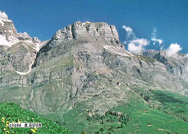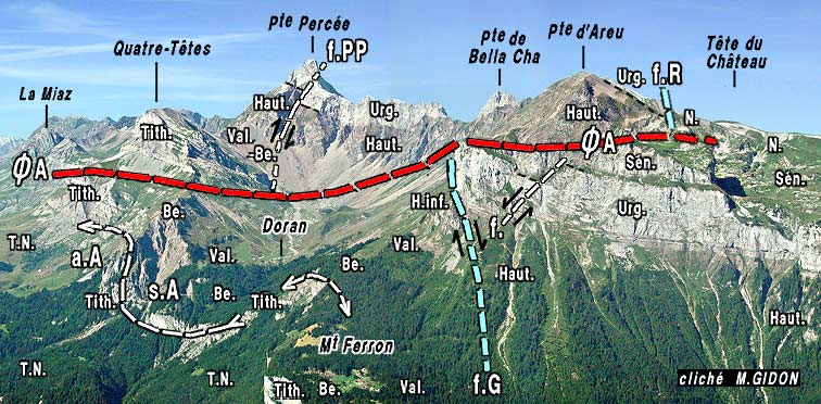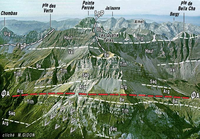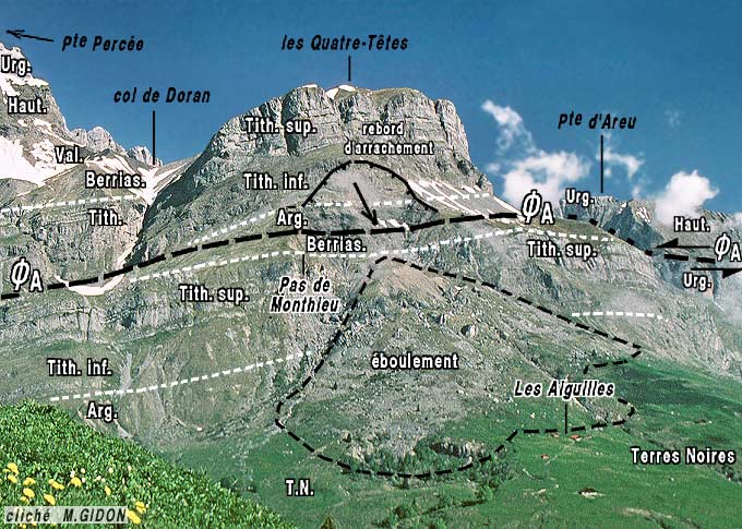 ![]() La montagne des Quatre-Têtes vue du sud-est, depuis la Tête Noire (Cordon) Le terme de "Tith. inf." désigne l'ensemble inférieur de la barre tithonique (= Kimméridgien - Séquanien). ØA = chevauchement d'Areu (voir la coupe A : c'est la cassure plate supérieure du soubassement de la Pointe Percée) Ce versant de la montagne porte les stigmates, aisément reconnaissables, d'un important éboulement, d'ancienneté vraisemblablement historique. |