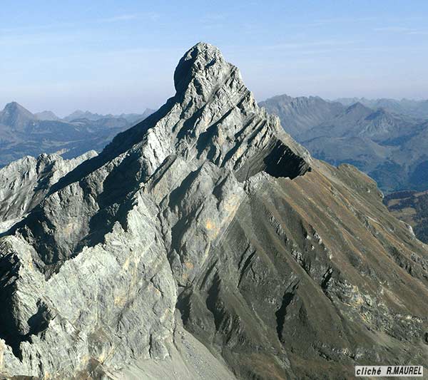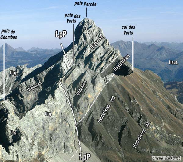 La Pointe Percée (2750 m.) est le sommet emblématique du chaînon des Aravis proprement dit. Elle doit son nom à ce que l'Urgonien du sommet est effectivement percé d'une ouverture qui traverse son arête nord d'est en ouest. La pyramide sommitale doit la hauteur de ses abrupts au pendage de ses couches, proche de 45° et surtout au fait que la dalle urgonienne y est surhaussée, par rapport aux dalles de son versant ouest, par une faille NE-SW, la faille de la Pointe Percée qui, bien qu'elle ne soit pas très évidente à observer dans les abrupts locaux du sommet, montre une belle continuité longitudinale.
