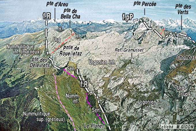 Le rebroussement des couches nummulitiques contre la faille de la Rouelletaz est sans doute originellement un crochon* de faille extensive. Mais il a probablement été accentué ultérieurement par les compressions horizontales post-Nummulitiques, ceci en liaison avec le fonctionnement du chevauchement d'Areu, accident qui est ici invible (car masqué en profondeur) mais dont la présence est mise en évidence plus au NE à la faveur de la profonde entaille de la vallée de l'Arve (voir la page "Pointe d'Areu"). |