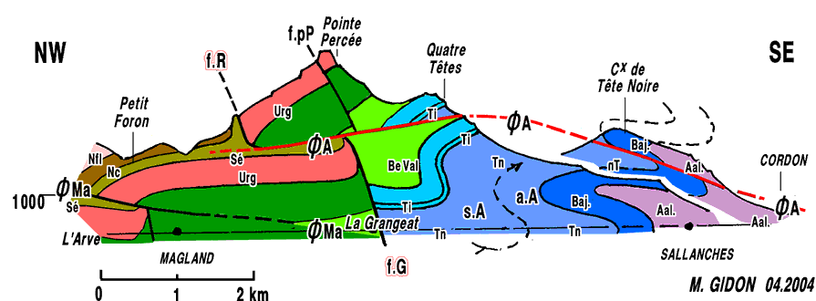 ![]() Coupe composite du versant oriental des Aravis selon la transversale de la Pointe Percée complétée interprétativement jusqu'à la vallée de l'Arve ØCB = chevauchement de Croise Baulet ; ØM = chevauchement de La Miaz ; ØA = chevauchement d'Areu ; ØMa = chevauchement de Magland. s.A = synclinal d'Arpenaz ; a.A = anticlinal d'Arpenaz. Failles extensives anciennes : f.G = faille de la Grangeat ; f.R = faille de La Rouelletaz (prolongement de la précédente, décalé par le chevauchement d'Areu ) ; f.pP = faille de la Pointe Percée : l'emplacement où cette faille se prolongeait sous le chevauchement n'est pas indiqué : sa surface de cassure devait limiter du côté gauche, l'escarpement tithonique inférieur des Quatre Têtes et être tordue plus bas, au sein des Terres Noires, par les plis de ce versant. |