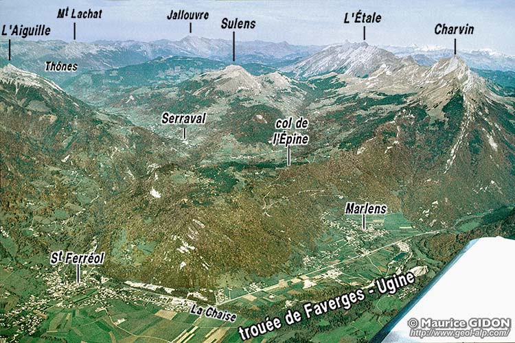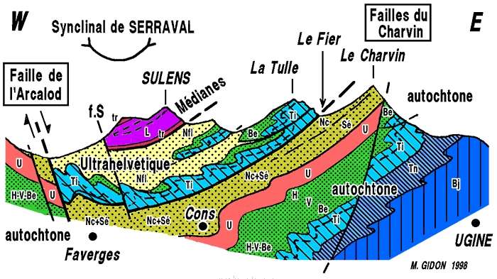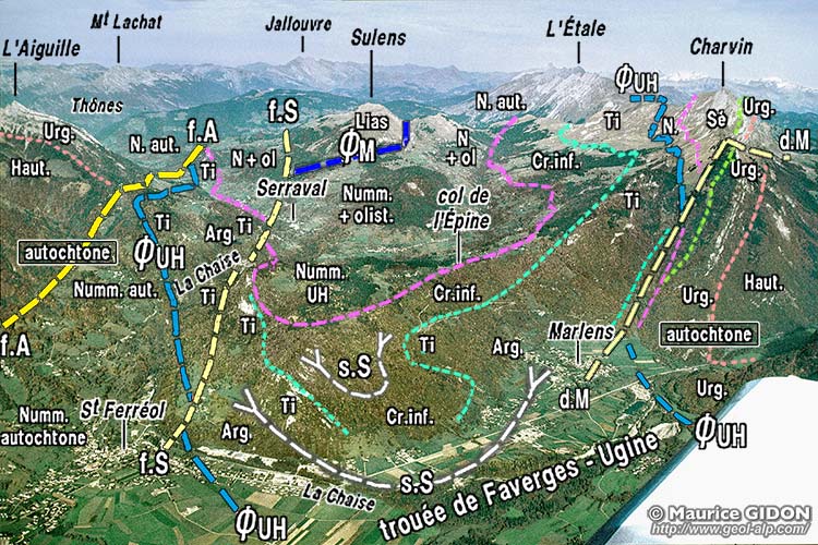 ![]() La partie méridionale de la cuvette de Thônes vue d'avion, du sud, depuis l'aplomb de Cons - Sainte-Colombe. ØM (en bleu foncé) = surface de charriage des unités médianes (Trias et Lias de la klippe de Sulens) ; ØUH (en bleu clair) = surface de charriage des unités ultrahelvétiques (certaines imbrications de détail de ces unités n'ont pas été représentées, non plus que le détail des olistolites qui y sont inclus dans le Nummulitique). f.A = faille d'Arcalod (branche principale) ; f.S = faille de Serraval (satellite oriental de la faille d'Arcalod) ; s.S = synclinal de Serraval ; d.M = décrochement de marlens (prolongement du décrochement de Saint-Ruph, des bauges). |
