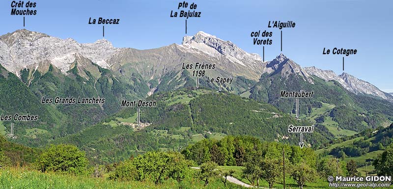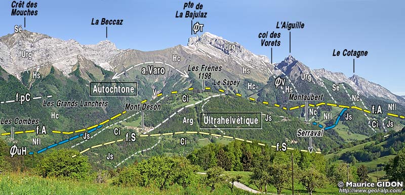 - à la base du matériel jurassique supérieur et crétacé, plissé et imbriqué en écailles : ces couches sont clairement charriées sur le flysch nummulitique autochtone qu'elles recouvrent qui affleure surtout à l'est de Serraval dans les pentes du chaînon du Charvin ; ce sont elles qui arment les reliefs fermant du côté sud la dépression de Serraval ;
