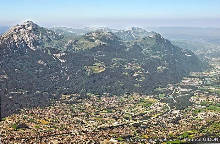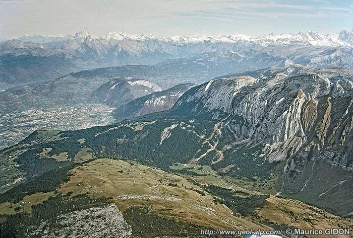 L'urgonien, dénudé par l'érosion, de l'anticlinal des Leschaux, dont l'axe plonge vers la gauche (vers le nord-est), détermine un relief conforme* ("mont jurassien").