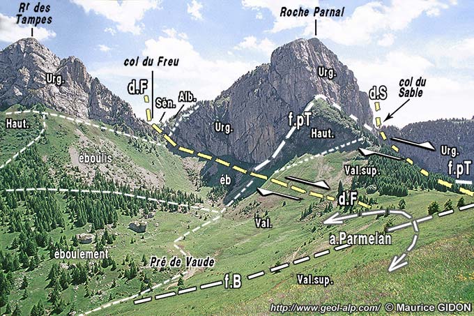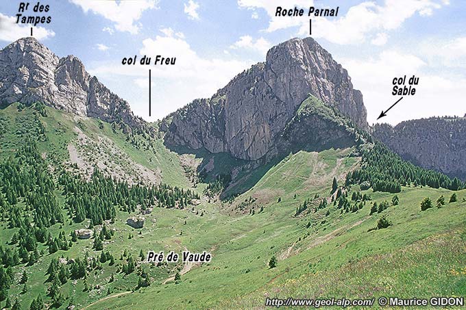 Du côté sud-est du cirque de la Balme au contraire l'Urgonien du flanc opposé de l'anticlinal du Parmelan forme un crêt* sur lequel se détachent les pointes de la Roche Parnal et des Rochers des Tampes. Ces deux sommets sont séparés par le col du Freu, qui se situe à un endroit où l'abrupt de ce crêt est décalé dans le sens dextre d'environ 500 m. De fait, sur le revers SE du crêt la limite occidentale des affleurements sénoniens et nummulitiques du synclinal de Champ-Laitier - Solaison, bute à angle droit contre un plan de faille NW-SE, au nord duquel se développe la dalle urgonienne des Tampes.