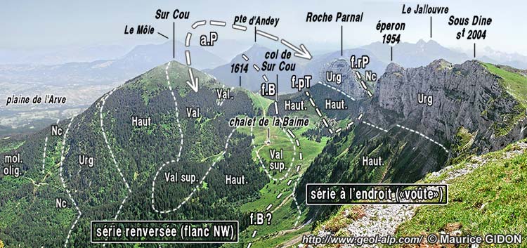 Cette situation est due au fait que le flanc NW de l'anticlinal du Parmelan subit là un renversement vers le NW ; mais on ne voit pas la charnière de ce pli qui devrait se trouver dans la dépression de la Balme : elle y est en fait remplacée par une surface inclinée vers le SE qui fait se superposer deux successions de polarité opposée, la supérieure, celle de Sous-Dine (flanc normal, ployé en une ample voûte) reposant en chevauchement sur l'inférieure, de Sur-Cou (flanc inverse). Cette surface s'avère correspondre à l'aboutissement amont de la faille de Beffay, laquelle détermine le ravin de ce nom sur le versant qui descend vers le Borne et dont la surface verticale au niveau du lit du Borne se tord vers le haut, par "rabattement" vers le NW de sa partie supérieure (voir le cliché ci-dessous). .