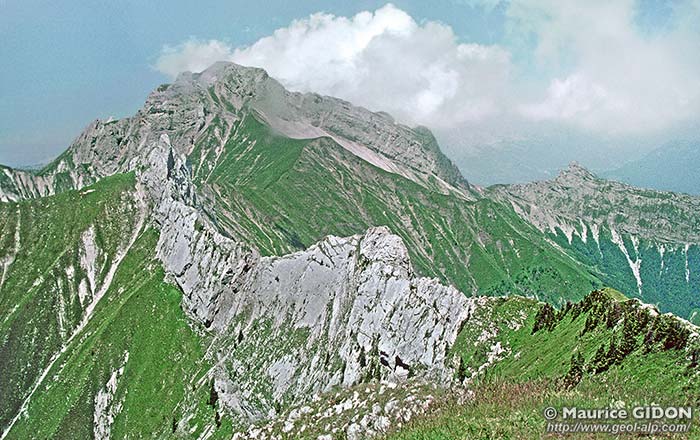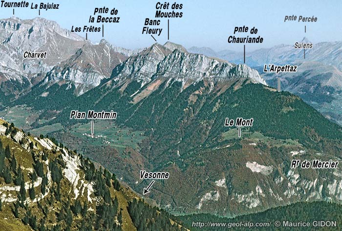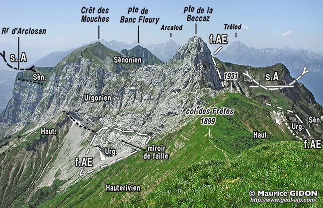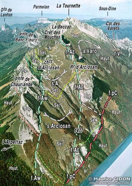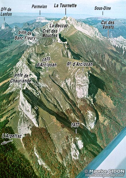 Au sud de la crête transversale qui joint ce sommet à celui de Banc Fleury ces deux arêtes parallèles délimitent le vallon d'Arclosan : c'est un val suspendu* drainé vers le sud mais qui est tranché à son extrémité aval par les escarpements boisés du revers oriental de la bosse de l'Arpettaz. Ce sens de drainage n'est pas dû à ce que le synclinal d'Arclosan plonge dans cette direction (de façon d'ailleurs peu caractérisée) mais plutôt à ce qu'il y est sectionné par la faille d'Arcalod, qui décale et abaisse son fond : elle fait ainsi buter l'extrémité des affleurements de son cœur sénonien contre les terrains hauteriviens du flanc NW du trans-synclinal de Serraval, que l'érosion a profondément affouillé en contrebas des falaises urgoniennes.