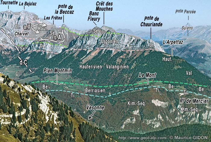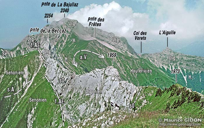Plus au nord encore, à la latitude de la Pointe des Frêtes, le cœur synclinal (Sénonien et Urgonien) se développe seulement dans le versant occidental de la crête de la montagne et son rôle morphologique disparaît (la crête du chaînon est sculptée dans l'Hauterivien du flanc oriental de ce pli). En outre, dans ce versant ouest de la crête, les couches du cœur synclinal sont tranchées obliquement par le décrochement dextre du Charvet, qui modifie beaucoup les rapports entre structure et topographie : au nord de cette faille transverse le cœur sénonien du synclinal affleure au flanc des abrupts presque totalement urgoniens du versant occidental de La Tournette, (voir la page "Tournette sud").