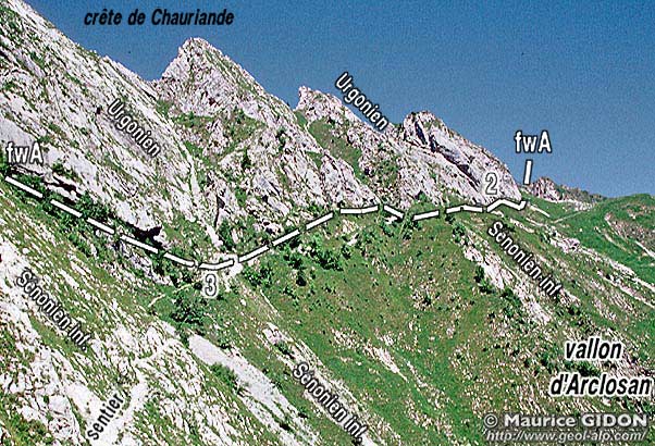 ![]() La faille ouest d'Arclosan (fwA), le long du sentier, en aval des chalets. Les numéros 2 et 3 désignent les points d'observations significatives |