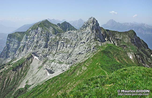 Mais l'érosion affecte différemment la structure en mettant ici en relief l'Urgonien du flanc est du pli, lequel subit d'autre un basculement vers l'ouest tel que les couches y sont presque verticales (environ 70° vers l'ouest) : ce basculement correspond au fait que, dans sa partie haute, la structure synclinale se déverse vers l'ouest. Dans le même temps la faille orientale, également basculée, conserve à peu près son pendage par rapport aux couches (c'est-à-dire de 65° environ) et prend, de ce fait un pendage vers l'est de l'ordre de 45° est.