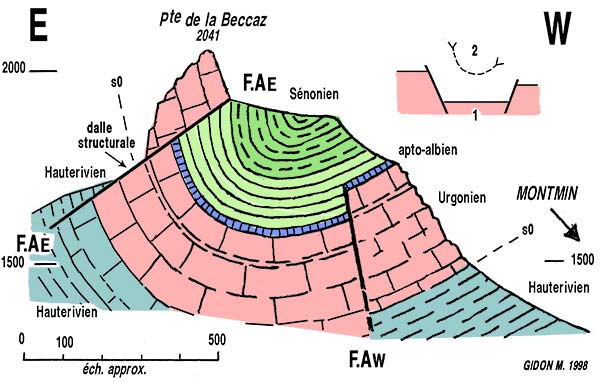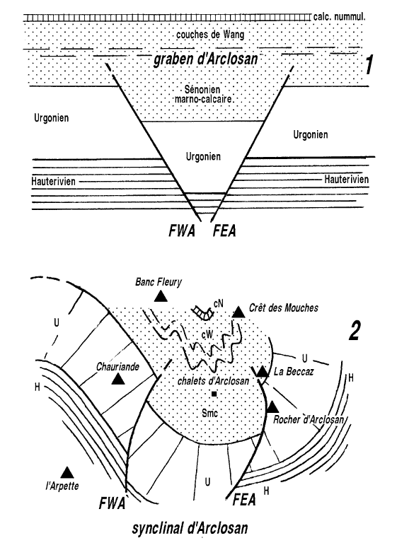 ![]() Coupe du synclinal d'Arclosan au niveau de la Beccaz. F.AW = faille ouest d'Arclosan ; F.AE = faille est d'Arclosan ; s0 = surface de stratification à la limite supérieure de l'Hauterivien. Le petit schéma en haut à droite rappelle les deux étapes : 1 = graben anté Sénonien supérieur ; 2 = plissement déversé vers l'ouest. |