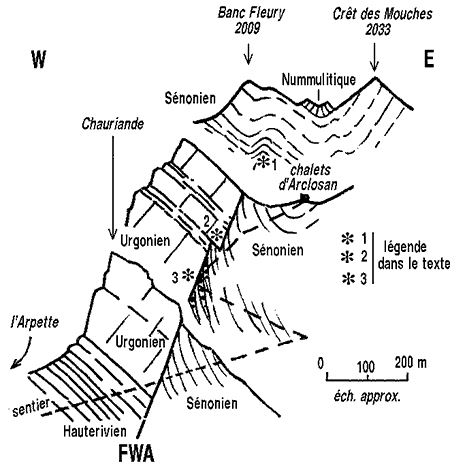 Observations relatives à la faille occidentale (on a indiqué le tracé du sentier montant aux chalets d'Arclosan) :