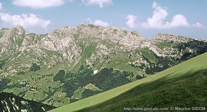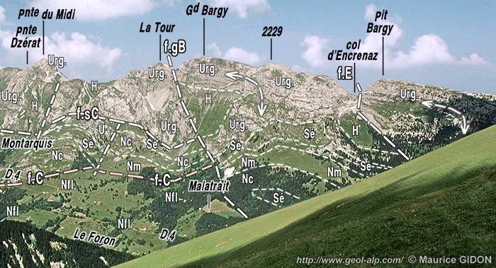 ![]() Le versant sud-oriental du Bargy, vu du sud-est depuis les pentes du Château (Pointe d'Areu). failles longitudinales par rapport à l'axe de l'anticlinal : f.C = faille principale de la Colombière ; f.Cs = faille supérieure de la Colombière ; failles transversales ; f.gB = faille du Grand Bargy ; f.E = faille d'Encrenaz. pour la suite vers la gauche se reporter à la page "Colombière". |