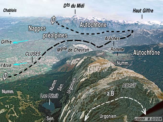 Une seconde coupe naturelle de ce pli est donnée, plus au NE sur la transversale de la ville de Cluses, par la vallée de l'Arve, qui l'entaille en y pratiquant une cluse* bien typique. Plus au nord-est, en rive droite de l'Arve, la voûte urgonienne du pli se prolonge par la montagne de Chevran avant de s'enfoncer, entre Arve et Giffre, sous son enveloppe de couches nummulitiques, que surmonte le matériel charrié d'origine interne (ultra-helvétique et Préalpes). Même à ce niveau on constate, à la faveur de l'entaille du ruisseau de l'Encrenaz (au NE de Cluses), que le flanc occidental du pli y est également rompu en chevauchement (voir la page "Cluses").