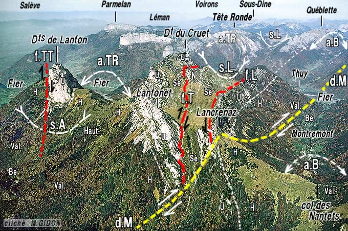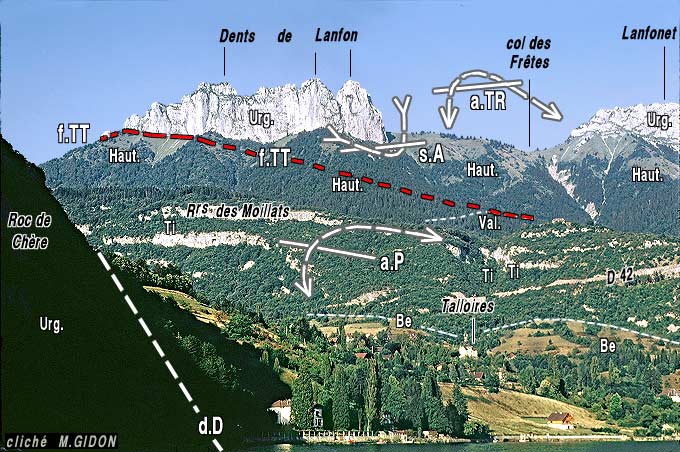 ![]() Le chaînon des Dents de Lanfon et de la Dent de Cruet vu du SW, depuis le lac d'Annecy au large de Talloires. a.P = anticlinal du Parmelan ; s.A = synclinal d'Ablon (et des Dents de Lanfon) ; a.TR = anticlinal de Tête Ronde : f.TT = prolongement méridional de la faille de la Tête à Turpin (faille antérieure au plissement.) |