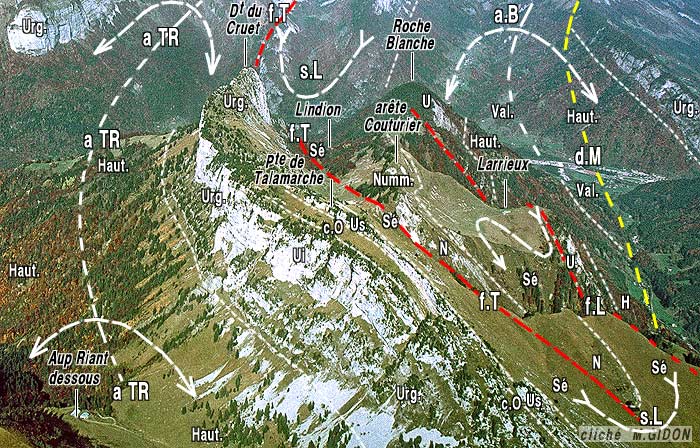 ![]() Le chaînon de la Dent de Cruet et les Dents de Lanfon vu du SW, d'avion (vue à peine oblique à l'axe des plis). s.A = synclinal d'Ablon (et des Dents de Lanfon) ; a.TR = anticlinal de Tête Ronde ; s.L = synclinal du Lindion - Glières orientales) ; a.B = anticlinal du Bargy. Failles antérieures au plissement (en rouge) : f.TT = prolongement méridional de la faille de la Tête à Turpin, dans le versant ouest des Dents de Lanfon ; f.T = faille du roc de Talamarche ; f.L = faille du Roc Lancrenaz. d.M (en jaune) = décrochement de Montremont. Noter la disposition, en graben effondré, du coeur du synclinal du Lindion. On distingue en outre, au niveau de l'Urgonien du fond de synclinal (à l'ouest du Roc de Lancrenaz), que la surface de faille du Roc de Talamarche a été déformée en escalier, sans doute par glissements couches sur couches : ceci est un argument pour admettre l'antériorité de la faille par rapport au plissement. |