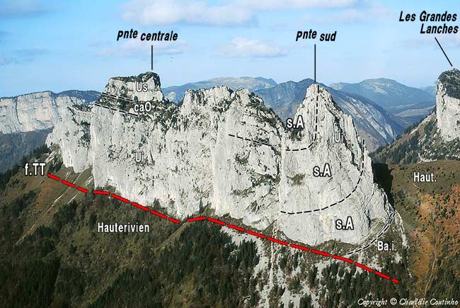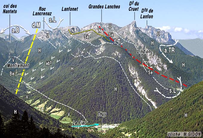 - 1 - Les Dents de Lanfon constituent une typique "butte-témoin" : elles représentent tout ce qui reste du coeur d'Urgonien du synclinal d'Ablon. Comme pour ce dernier au NE du Fier, on constate que la charnière du pli s'appuyait du côté ouest contre une faille extensive (faille de la Tête à Turpin), qui remonte ici l'Hauterivien affleurant au pied des falaises de la face ouest (qui tombent vers le lac d'Annecy).