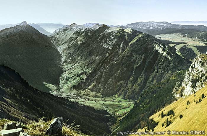 ![]() La "boutonnière" d'Entremont vue du sud-ouest, depuis le chalet de l'Ovine s.C = synclinal de Cenise ; a.B = anticlinal du Bargy ; f.C = faille du col de la Colombière Deux combes anticlinales ouvertes l'un comme l'autre dans l'anticlinal du Bargy se réunissent à Entremont pour élargir, vers le nord comme vers le sud, l'entaille de la vallée du Borne. Concernant les plus hautes pentes de la rive droite du Borne voir la page "Jallouvre" |