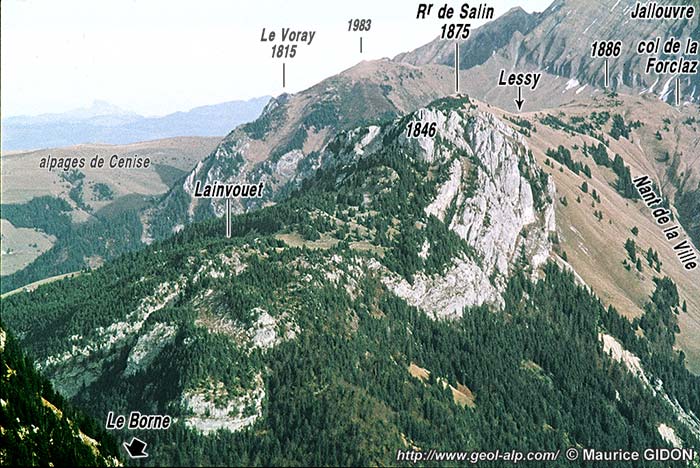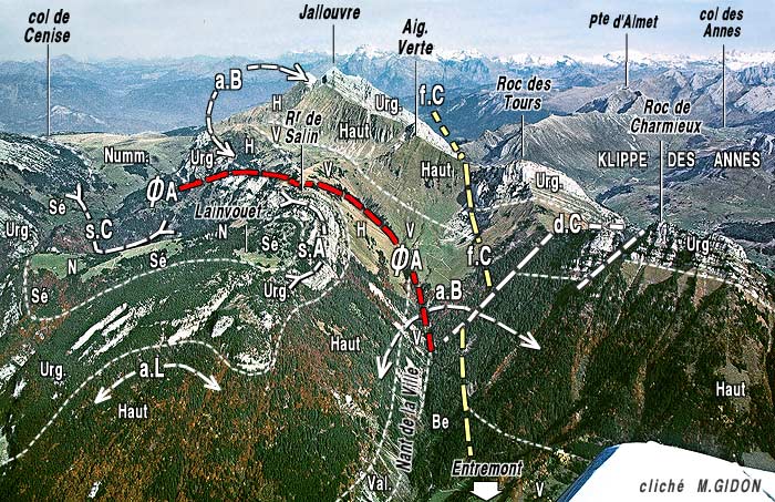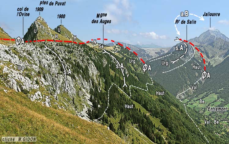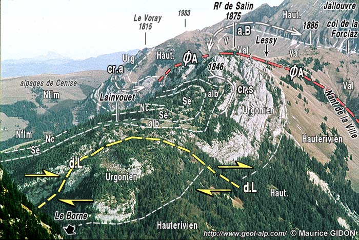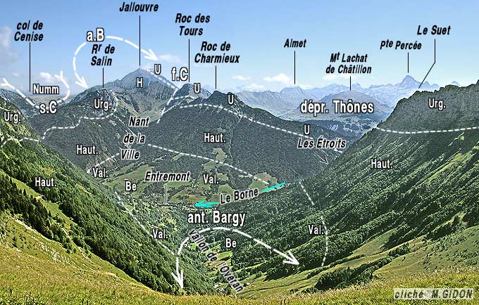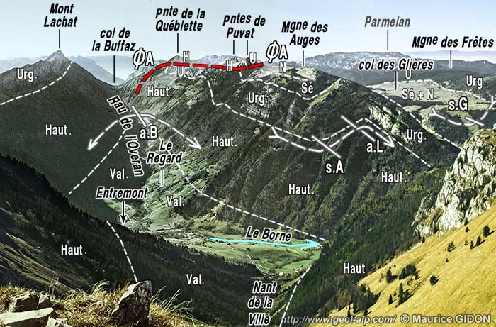 ![]() La rive gauche du Borne, vue du NE, depuis la rive droite (de l'Aiguille Verte du Chinaillon). a.B = anticlinal du Bargy ; ØA = chevauchement des Auges ; s.A = synclinal des Auges ; a.L = anticlinal du Lainvouet ; s.G = synclinal des Glières. |