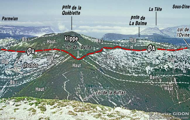Plus au sud, à la Pointe de Québlette ce sont essentiellement des couches hauteriviennes qui coiffent la crête. Toutefois l'Hauterivien de ce sommet n'est pas en repos stratigraphique renversé sur l'Urgonien qui arme plus bas cette crète. En effet ces couches sommitales ont un pendage subvertical, bien qu'elles reposent, peu en contrebas, sur la tranche de bancs d'Urgonien disposés de façon également sub-verticale.