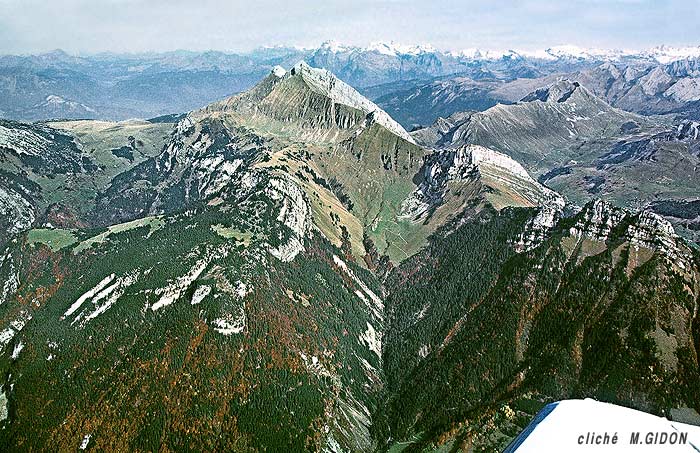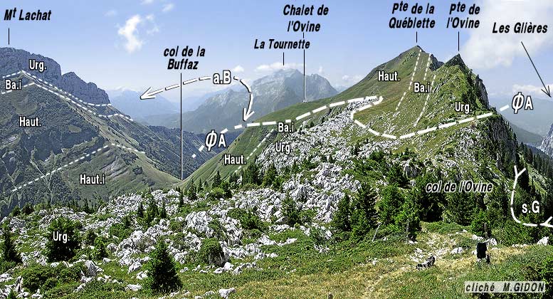 ![]() La Pointe de Québlette vu du SE, depuis le sommet du Mont Lachat de Thônes ØA = chevauchement des Auges. |