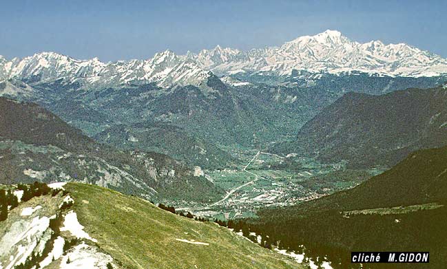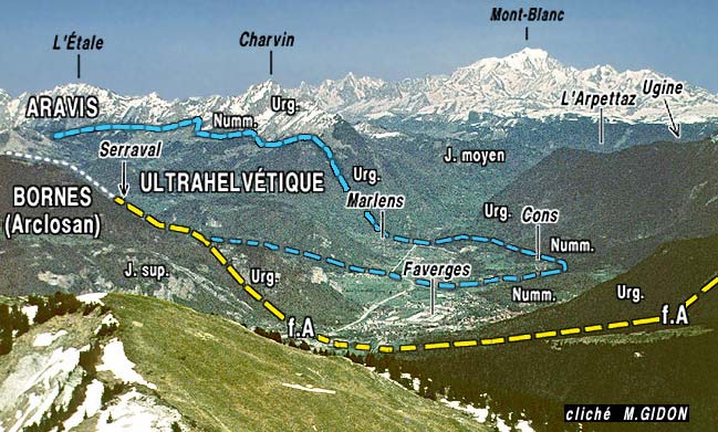 ![]() La partie moyenne de la Trouée de Faverges - Ugine vue d'enfilade, de l'ouest, depuis la montagne du Charbon f.A = faille de l'Arcalod |