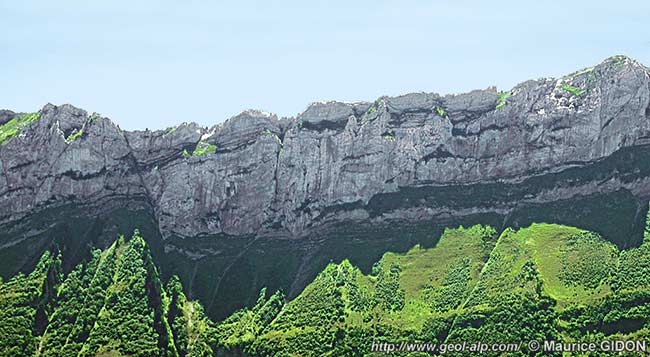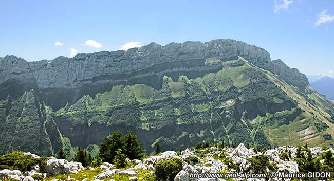 1 - Au nord de Thônes, le Mont Lachat est un crêt tout à fait typique formé par la dalle urgonienne du flanc nord-ouest du synclinorium de Thônes.