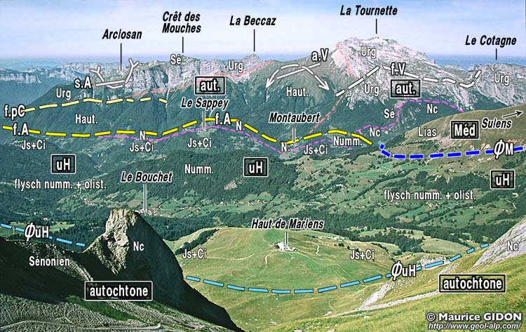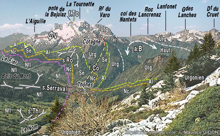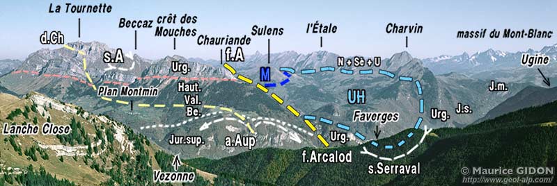![]() Le chaînon de la Tournette (versants sud), vu d'avion depuis l'aplomb de Faverges. Plis : a.F = anticlinal de la Forclaz ; s.L = synclinal du Lindion ; a.AW , A.AE = deux moitiés (occidentael et orientale) de l'anticlinal de l'Aup - Montmin ; s.A = synclinal d'Arclosan ; a.V = anticlinal du Varo. Failles anciennes (en rouge) : f.F = accident du col de la Forclaz ; f.M = faille de Mercier (voir clichés en fin de page) ; f.AW, f.AE = failles ouest et est d'Arclosan. Failles du faisceau de l'Arcalod (en jaune) ; d.Ch= décrochement de Charvet ; f.M = faille de Mercier ; f.pC = faille du Plan du Chouet (= branche occidentale de la faille de l'Arcalod) ; f.Ar = faille principale de l'Arcalod. |