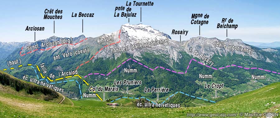 Au NE du sommet le versant oriental du chaînon est essentiellement constitué par le flanc oriental de l'anticlinal du Varo, dont la dalle urgonienne est dégagée sur de larges surfaces (souvent en dalles structurales*) et s'enfonce, en bas de pente, sous les reliefs mous du Nummulitique de la dépression de Thônes.