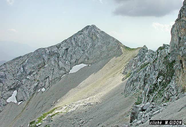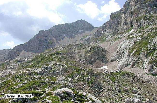 - entre ces deux lignes de crête l'existence de un secteur aplani en pente régulière qui n'est pas une dalle structurale car elle coupe en biseau les couches urgoniennes successives, qui sont plus pentées que cette surface d'érosion. Il est limité par les abrupts des rebords des deux chevrons.