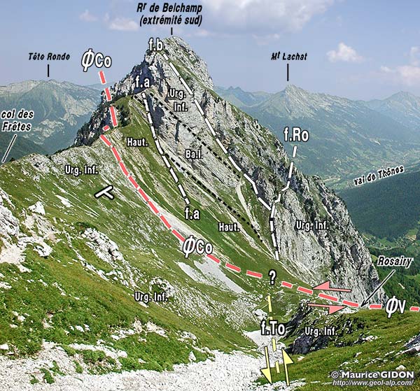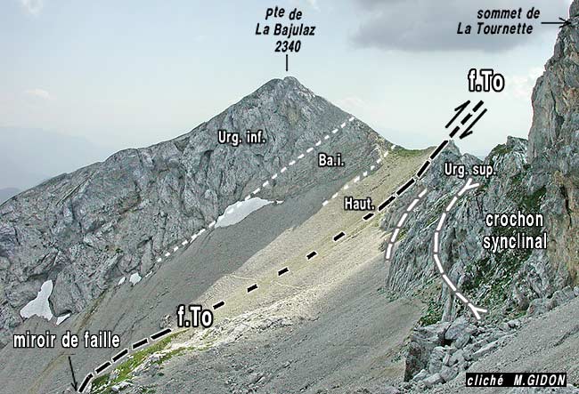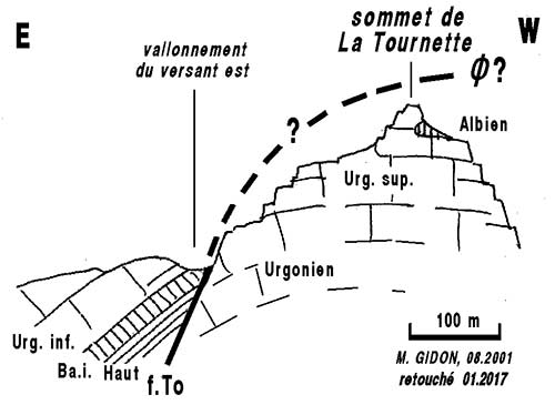 ![]() coupe interprétative schématique du sommet de La Tournette Cette coupe, orientée comme le cliché précédent, montre la partie supérieure des pentes du versant est de la Tournette. f.To = faille de La Tournette ; Ø? = hypothétique rejeu avec inflexion et avancée de la lèvre supérieure en chevauchement (responsable du rebroussement de l'Urgonien du sommet). |