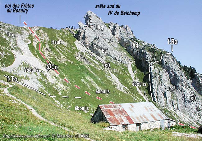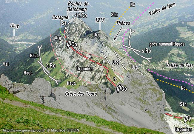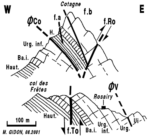 ![]() Coupe composite de l'extrémité méridionale de la crête de la montagne de Cotagne (combinaison de deux coupes, l'une à la latitude des chalets de Rosairy et l'autre un peu plus au nord), donnant un schéma interprétatif du cliché ci-dessus |