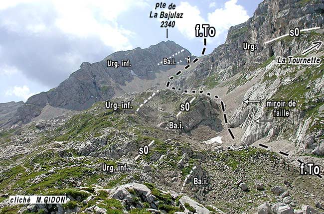 Cette transformation se confirme au col séparant la Pointe de Bajulaz de l'extrémité sud de la crête du sommet de la Tournette. On y voit même que la surface de faille vient tangenter le flanc inverse du synclinal de la Tournette (qu'elle finit par sectionner en biseau). Cette disposition suggère assez clairement que la surface de faille a du rejouer en se tordant et que sa lèvre supérieure a subi un cisaillement vers l'ouest qui l'a fait avancer en chevauchement : ce mouvement apparaît donc être le responsable du rebroussement en un crochon* de l'Urgonien du sommet.