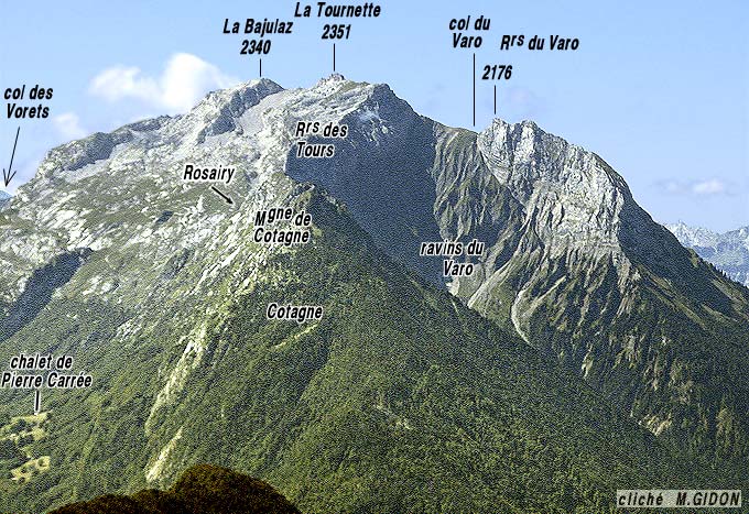 Depuis l'arête septentrionale de la montagne de La Tournette se détache, en direction du NE, une crête qui s'abaisse progressivement jusqu'à Thônes, où elle finit, tranchée par les étroits du Fier, à la sortie aval de cette localité (voir la page "Thônes"). Il s'agit pour l'essentiel d'un crêt* regardant vers l'ouest, qui limite du côté NW le glacis rocheux du revers est de La Tournette (mais à mi-parcours ce crêt présente un important ressaut constitué par la montagne du Cotagne (qui est analysée en fin de la présente page).