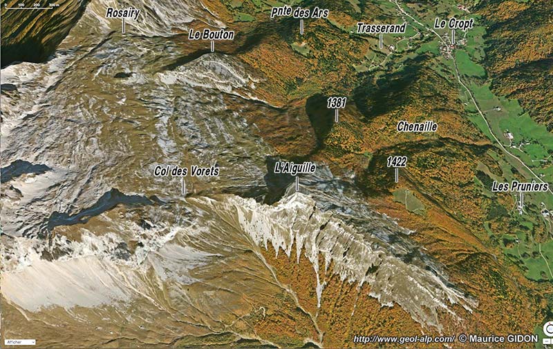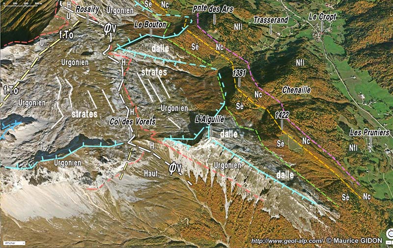 Or au delà, dans le revers oriental de la montagne du Cotagne, on observe une faille sub-verticale (appelée ici "faille de Rosairy") qui semblerait, à première vue, en représenter le prolongement. Mais cette interprétation se heurte au fait que son sens de rejet est inverse. En outre le tracé du chevauchement des Vorets décrit un profond V topographique dans le ravin sous le chalet de Rosairy : il y a la plus grande vraisemblance pour que ce tracé remonte sous les prairies en longeant le pied des abrupts de rive nord de ce ravin pour se prolonger par celui du Cotagne, que l'on voit affecter la crête au nord des alpages.