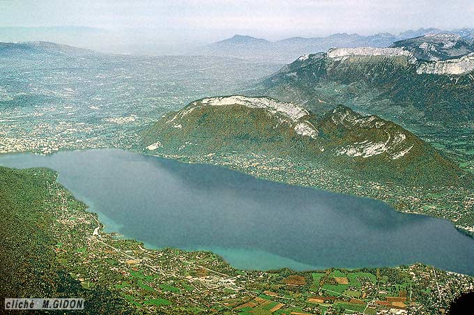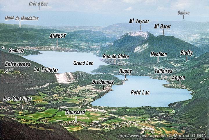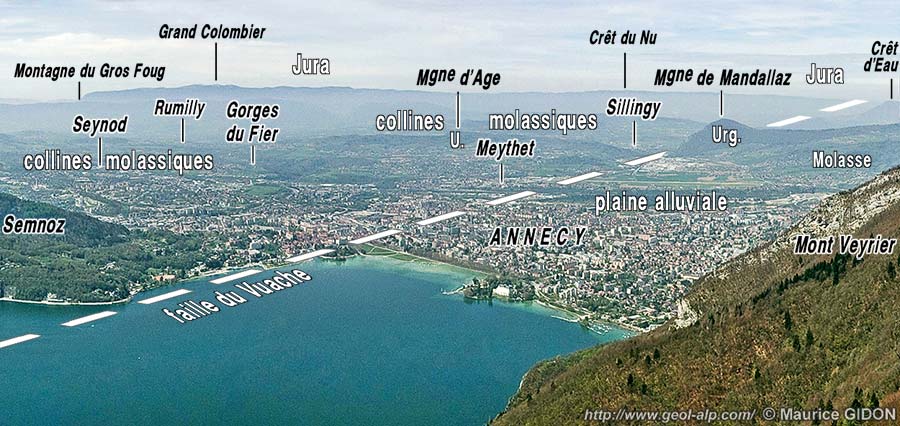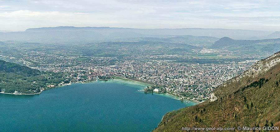 La ville d'Annecy est installée au débouché septentrional de la trouée qui sépare l'un de l'autre les massifs subalpins septentrionaux des Bauges et des Bornes. Cette trouée d'Annecy (voir la page "Annecy SW") débouche, à cette ville même, dans le sillon molassique péri-alpin, à faible distance de premiers chaînons franchement jurassiens (montagne de Mandalaz, représentant l'extrémité méridionale du Salève). Ces derniers se terminent, par ennoiement sous la molasse miocène, avec la montagne d'Age, que le Fier coupe en gorges (à son extrémité méridionale), à Lovagny.