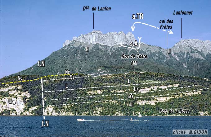 En effet elle se trouve dans une dépression N-S qui est l'aboutissement du talus des affleurements de Berriasien qui garnissent le flanc ouest de l'anticlinal d'Angon. Ce pli, dont le cœur de Séquanien est traversé par la gorge du torrent d'Oy a en effet un axe sensiblement N-S et se prolonge vers le sud en bordure orientale du lac (il représente vraisemblablement le prolongement méridional de l'anticlinal du Parmelan). Les alluvions glaciaires de cette dépression masquent donc là une frontière structurale qui limite brutalement les affleurements du Roc de Chère et que ne franchit pas le décrochement du Vuache. Il correspond à un accident d'azimut proche de N-S qui se place clairement dans le prolongement du décrochement de Duingt et doit donc le prolonger (cet accident coupe en sens dextre, sur la rive ouest, le synclinal d'Entrevernes : voir la page "Annecy SW").
