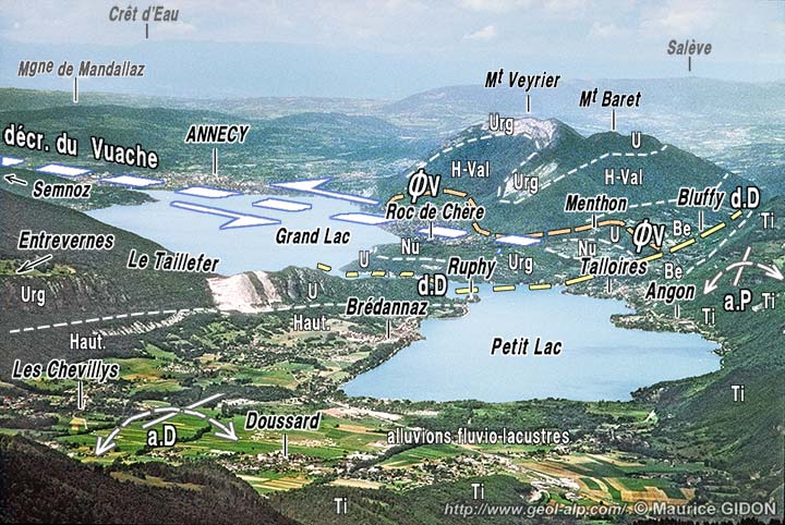 Entre Talloires et Bluffy le tracé du décrochement est jalonné par le fait qu'il tranche l'extrémité sud-orientale de la barre rocheuse qui porte à son extrémité opposée le château de Menthon-Saint-Bernard. Il s'agit d'une lame d'Urgonien qui est renversée vers le SW sur du Nummulitique ; elle est en outre tronquée du côté NE car elle est peu épaisse et y supporte directement des calcaires du Fontanil. Elle représente assez clairement le bord oriental du synclinal de Leschaux, rebroussé en crochon sous le chevauchement de Veyrier : en effet le tracé de ce dernier aboutit bien là, depuis le nord, en contournant l'éperon montagneux du Mont Baret par son pied sud (voir plus haut le cliché d'ensemble des deux lacs) .
