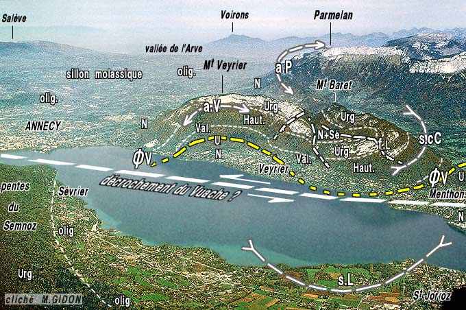 L'azimut de la barre urgonienne de Menthon-Saint-Bernard est sensiblement N160, c'est-à-dire qu'il s'écarte d'environ 40° de l'azimut habituel des plis de ce secteur ; ceci peut être rapproché du fait que, immédiatement plus au nord, l'axe du synclinal du Col des Contrebandiers se tord au niveau de ce col pour prendre, plus au sud, au Mont Baret, un azimut de N175. Enfin il faut ajouter que, du côté est du décrochement, l'axe de l'anticlinal d'Angon se tord de façon similaire par rapport à son azimut au Parmelan. |
