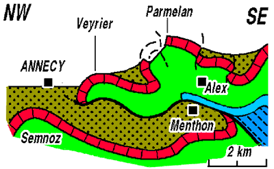 Coupe schématique des environs orientaux d'Annecy (en rouge l'Urgonien ; en bleu le Jurassique) |